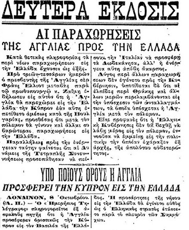 Είναι η εποχή που η Αθήνα για πρώτη φορά εντάσσει το Κυπριακό στις υπόλοιπες εθνικές της διεκδικήσεις. Και αυτό γίνεται επί πρωθυπουργίας Ελευθερίου Βενιζέλου, ο οποίος και συζήτησε για πρώτη φορά το ενδεχόμενο παραχώρησης της Κύπρου στην Ελλάδα.