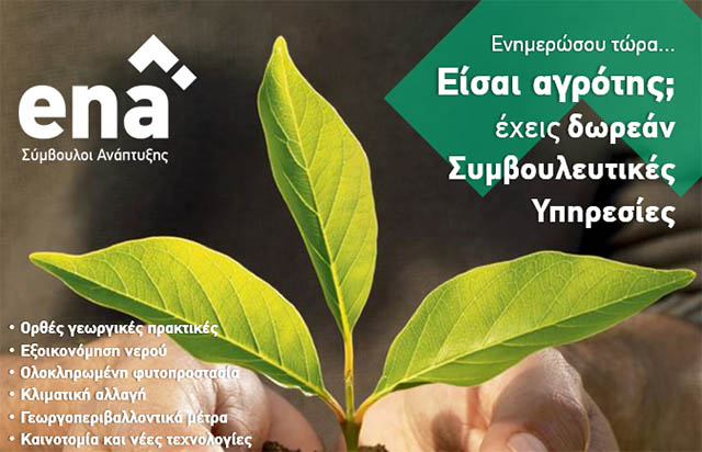 Με συνέπεια και σεβασμό στις ανάγκες των αγροτών και με γνώμονα την καλύτερη δυνατή εξυπηρέτηση του παραγωγού, η ena Σύμβουλοι Ανάπτυξης παραμένει δίπλα στον γεωργό, συμβάλλοντας στη βελτίωση τόσο της αειφόρου διαχείρισης, όσο και της συνολικής απόδοσης των γεωργικών εκμεταλλεύσεων.