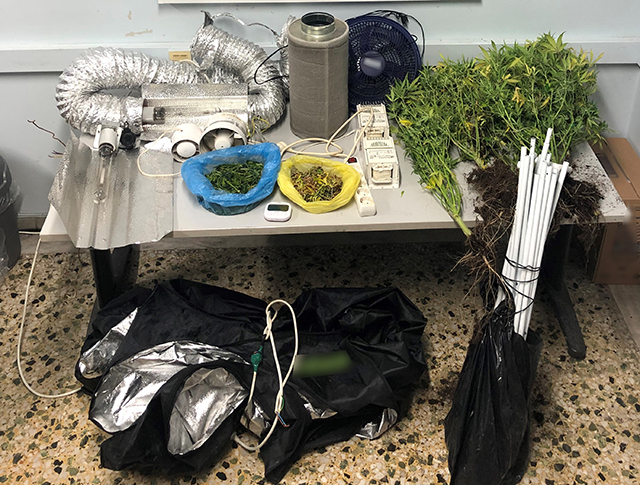 - 1 ολοκληρωμένο και λειτουργικό σύστημα για την καλλιέργεια φυτών κάνναβης σε εσωτερικό χώρο (αποτελούμενο από θάλαμο καλλιέργειας με ανακλαστήρα, μετασχηματιστές, σύστημα εξαερισμού, ανεμιστήρες, θερμόμετρο κ.α.), εντός του οποίου καλλιεργούσε 6 φυτά κάνναβης, ύψους 60 εκατοστών έως 1,2 μέτρων.