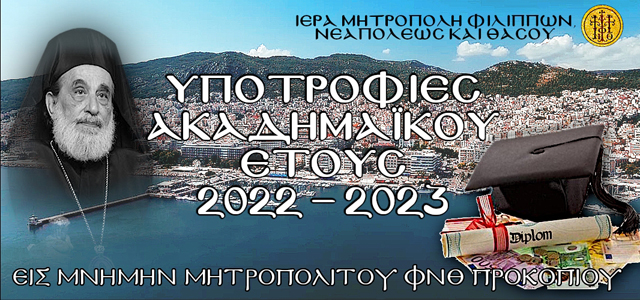 Απὸ την Ιερὰ Μητρόπολη Φιλίππων, Νεαπόλεως και Θάσου ανακοινώνεται, ότι, υλοποιώντας σχετική απόφαση του Σεβ. Μητροπολίτου μας κ. Στεφάνου, και σύμφωνα με την ιδιόγραφη διαθήκη του μακαριστοὺ Μητροπολίτου Φιλίππων, Νεαπόλεως και Θάσου κυροὺ Προκοπίου, ορίζουσα: «ό,τι υπόλοιπον ευρεθὴ εις τον προσωπικὸν μου τραπεζικὸν λογαριασμὸν να δοθὴ εις την Ιερὰν Μητρόπολιν δια την ενίσχυσιν του ειδικοὺ λογαριασμοὺ Εκκλησιαστικὼν Υποτροφιὼν», θα απονεμηθούν οι προκηρυχθείσες για το ακαδημαϊκὸ έτος 2022-2023 ΔΕΚΑ ΠΕΝΤΕ (15) υποτροφίες σε προπτυχιακοὺς φοιτητὲς με οικονομικὲς δυσκολίες, οι οποίοι εισήχθησαν εφέτος στα Ανώτατα Εκπαιδευτικὰ Ιδρύματα της Ελλάδος και κατάγονται απὸ τις επαρχίες της Ιερὰς Μητροπόλεώς μας και διαμένουν μόνιμα εντὸς των ορίων αυτὴς.