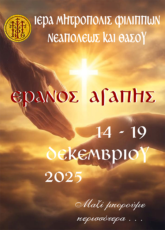 Γιά όλους τους παραπάνω λόγους, σάς προσκαλούμε, σάς παρακαλούμε και σας προτρέπουμε να ενισχύσουμε και εφέτος όλοι μαζύ, την προσπάθειά μας για τον ΕΡΑΝΟ ΤΗΣ ΑΓΑΠΗΣ, που θα πραγματοποιηθή ΑΠΟ ΤΗΝ ΚΥΡΙΑΚΗ 14 ΕΩΣ ΚΑΙ ΤΗΝ ΠΑΡΑΣΚΕΥΗ 19 ΔΕΚΕΜΒΡΙΟΥ 2025, δίδοντας την χρηματική βοήθειά μας στα συνεργεία των ιερέων, των κυριών και των δεσποινίδων που θ διεξαγάγουν τον ΕΡΑΝΟ σε κάθε ενορία, ή εν ανάγκη απ’  ευθείας στον ιερό Ναό, προσφέροντας από το περίσσευμα ή το υστέρημα της αγάπης μας, ό,τι μπορούμε.