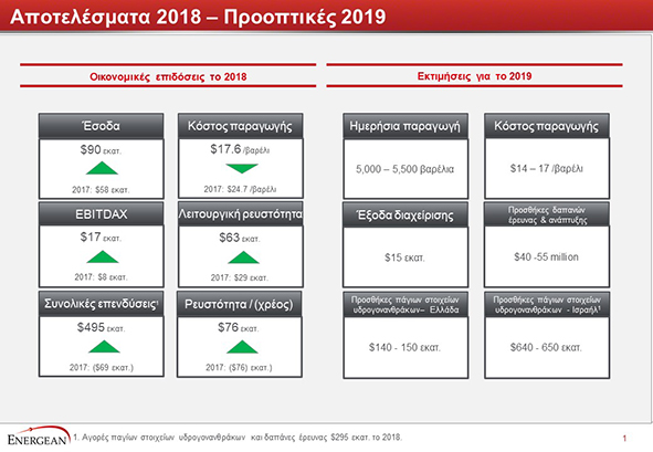 - Η πρόβλεψη για τη μέση παραγωγή του 2019 διαμορφώθηκε χαμηλότερα από την προηγούμενη, στις 5.000 – 5.500 βαρέλια ημερησίως, λόγω της καθυστέρησης που καταγράφηκε στην ολοκλήρωση της οριζόντιας γεώτρησης στο κοίτασμα Έψιλον.