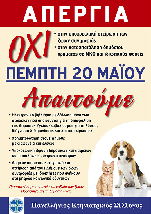 Ο Πανελλήνιος Κτηνιατρικός Σύλλογος ανακοίνωσε ότι την Πέμπτη 20 Μαΐου οι κτηνίατροι θα απεργήσουν. Τα αιτήματα: Όχι στην υποχρεωτική στείρωση των ζώων συντροφιάς. Εφαρμογή του ηλεκτρονικού βιβλιαρίου μόνο με δήλωση των στοιχείων εκείνων που αφορούν τη διασφάλιση της Δημόσιας Υγείας (εμβολιασμός για τη λύσσα, διάγνωση λεϊσμανίασης και λεπτοσπείρωσης). Όλες οι χρηματοδοτήσεις να αφορούν αποκλειστικά τους Δήμους με διαφανή τρόπο, έλεγχο, αξιολόγηση του έργου τους και βασική υποχρέωσή τους την ίδρυση δημοτικών κτηνιατρείων και την πρόσληψη μόνιμων κτηνιάτρων. Όχι στη χρηματοδότηση των Μ.Κ.Ο, φιλοζωικών σωματείων και οποιουδήποτε ιδιωτικού φορέα. Η δωρεάν σήμανση, καταγραφή και στείρωση ζώων συντροφιάς να αφορά αποκλειστικά τους πολίτες που είναι εγγεγραμμένοι στα μητρώα κοινωνικά αδυνάτων των Δήμων ή του ΟΠΕΚΑ.