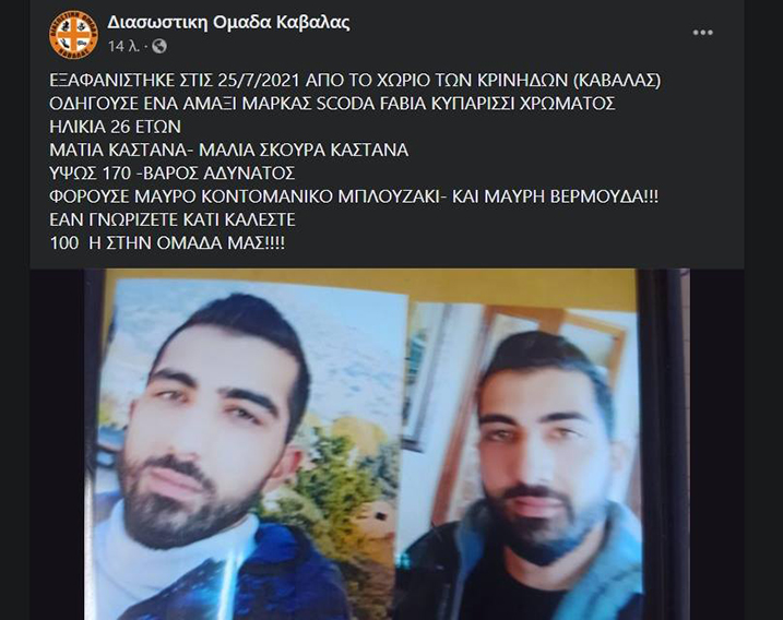 Εξαφάνιση 26χρονου από τις Κρηνίδες Καβάλας