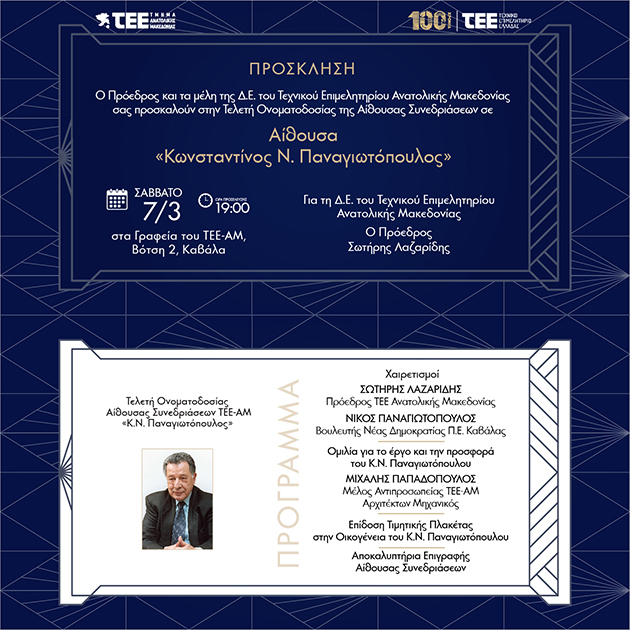 Το Σάββατο 7 Μαρτίου, στις 7 το απόγευμα θα πραγματοποιηθεί η Ονοματοδοσία της αίθουσας Συνεδριάσεων του ΤΕΕ – ΑΜ σε αίθουσα “Κωνσταντίνος Παναγιωτόπουλος”.