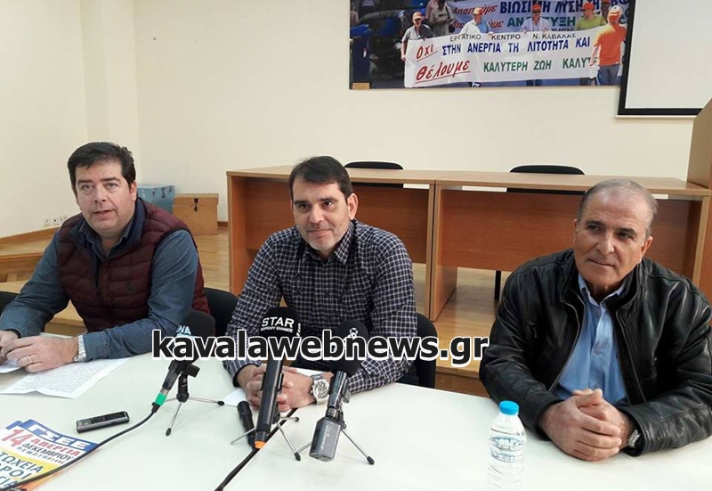 Κάλεσμα συμμετοχής στην γενική απεργία της Πέμπτης (14/12) απηύθυναν από κοινού, στο πλαίσιο συνέντευξης Τύπου που δόθηκε την Τρίτη (12/12), ο πρόεδρος του Εργατικού Κέντρου Καβάλας, ο πρόεδρος του τοπικού τμήματος της Α.Δ.Ε.Δ.Υ. και ο πρόεδρος των συνταξιούχων του εργοστασίου λιπασμάτων.