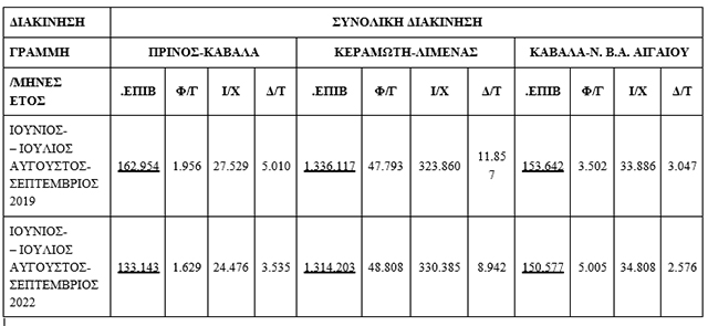 α) Συγκριτική συνολική διακίνηση επιβατών και οχημάτων των ετών 2019 και 2022 που μετακινήθηκαν με Ε/Γ – Ο/Γ, πλοία από και προς το νησί της Θάσου και από το λιμένα Καβάλας «Απόστολος Παύλος» προς τα νησιά του Β.Α. ΑΙΓΑΙΟΥ σύμφωνα με τον παρακάτω πίνακα: