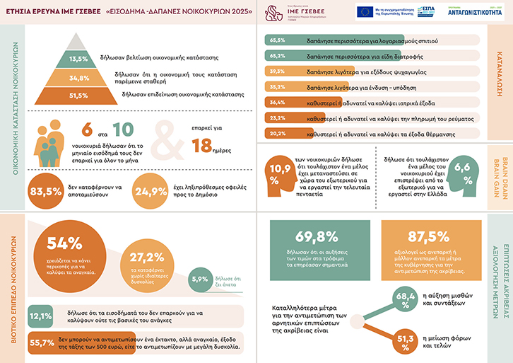 Η ετήσια έρευνα του ΙΜΕ ΓΣΕΒΕΕ για το εισόδημα και τις δαπάνες διαβίωσης των νοικοκυριών 2025 (14η κατά σειρά) αποτυπώνει τη συνεχιζόμενη και εντεινόμενη πίεση που δέχονται τα ελληνικά νοικοκυριά. Τα φετινά ευρήματα δείχνουν ότι οι οικονομικές δυσκολίες δεν περιορίζονται πλέον στα χαμηλά εισοδήματα, αλλά επεκτείνονται και στα μεσαία στρώματα, καθώς οι πληθωριστικές πιέσεις λειτουργούν σωρευτικά και εξαντλούν τις αντοχές των νοικοκυριών.