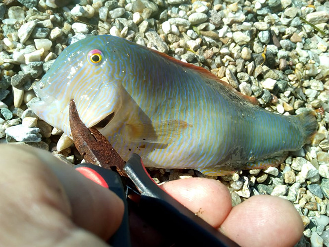 Πρόκειται για ένα παπαγαλόψαρο το οποίο έπιασε με καλάμι και με δόλωμα σκουλήκι ακροβάτη, ψαρεύοντας μουρμούρια από την ακτή στο Παχύ της Θάσου.