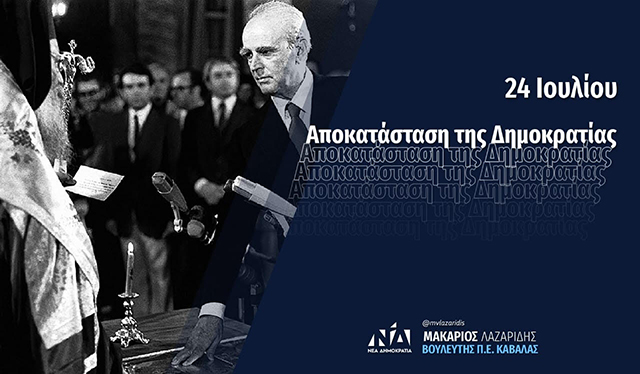 Ο Βουλευτής Π.Ε. Καβάλας της Νέας Δημοκρατίας, κ. Μακάριος Λαζαρίδης, για τη σημερινή, 48η επέτειο αποκατάστασης της Δημοκρατίας, έκανε την εξής δήλωση:
