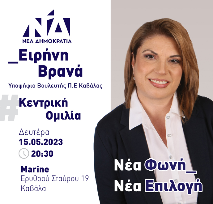 Σας προσκαλώ στην κεντρική προεκλογική μου ομιλία την ΔΕΥΤΕΡΑ 15 Μαΐου 2023 και ώρα 20.30 μ.μ. στο Marine (Care bar restaurant), Ερυθρού Σταυρού 19 (στην είσοδο του Λιμανιού Απόστολος Παύλος) στην Καβάλα.