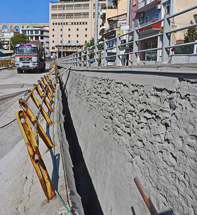 Πιο συγκεκριμένα, πρόκειται για τη δημιουργία μανδύα εκτοξευόμενου σκυροδέματος επί της υπάρχουσας λιθοδομής, προκειμένου να ενισχυθεί το τοιχίο αντιστήριξης της υφιστάμενης οδού κατά μήκος του παλιού νοσοκομείου.