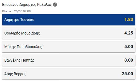 Ξεκάθαρο φαβορί στον δήμο Καβάλας δίνει η στοιχηματική εταιρεία Stoiximan την Δήμητρα Τσανάκα στις εκλογές του Μαΐου, μειώνοντας την απόδοση της δημάρχου Καβάλας στο τελευταίο «κουπόνι» των προβλέψεων.