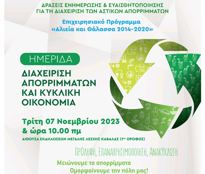 Ημερίδα σχετικά με την Ορθή Διαχείριση Απορριμμάτων διοργανώνει ο Δήμος Καβάλας, στο πλαίσιο των δράσεων, τις οποίες υλοποιεί για την ευαισθητοποίηση και ενημέρωση των δημοτών του αναφορικά με την ορθολογική διαχείριση απορριμμάτων, και συγκεκριμένα στο πλαίσιο της Πράξης «ΔΡΑΣΕΙΣ ΕΝΗΜΕΡΩΣΗΣ ΚΑΙ ΕΥΑΙΣΘΗΤΟΠΟΙΗΣΗΣ ΓΙΑ ΤΗ ΔΙΑΧΕΙΡΙΣΗ ΤΩΝ ΑΣΤΙΚΩΝ ΑΠΟΡΡΙΜΜΑΤΩΝ», του Επιχειρησιακού Προγράμματος «Αλιεία και Θάλασσα 2014-2020».