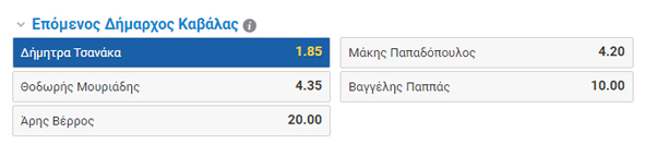 Στο κουπόνι που κυκλοφόρησε με τις αποδόσεις των υποψηφίων στον δήμο Καβάλας, δίνει το χαμηλότερο ποσοστό 1,85 και άρα τις περισσότερες πιθανότητες εκλογής στην δήμαρχο Δήμητρα Τσανάκα.