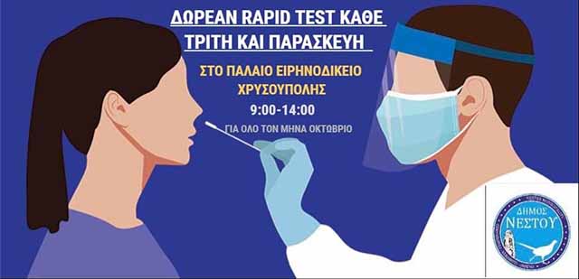 Ο Δήμος Νέστου σε συνεργασία με τον ΕΟΔΥ κάθε Τρίτη και Παρασκευή για όλο τον μήνα Οκτώβριο, θα πραγματοποιεί δωρεάν ελέγχους ταχείας ανίχνευσης κορωνοϊού (rapid covid-19 test) στο Παλαιό Ειρηνοδικείο Χρυσούπολης 9:00-14:00.