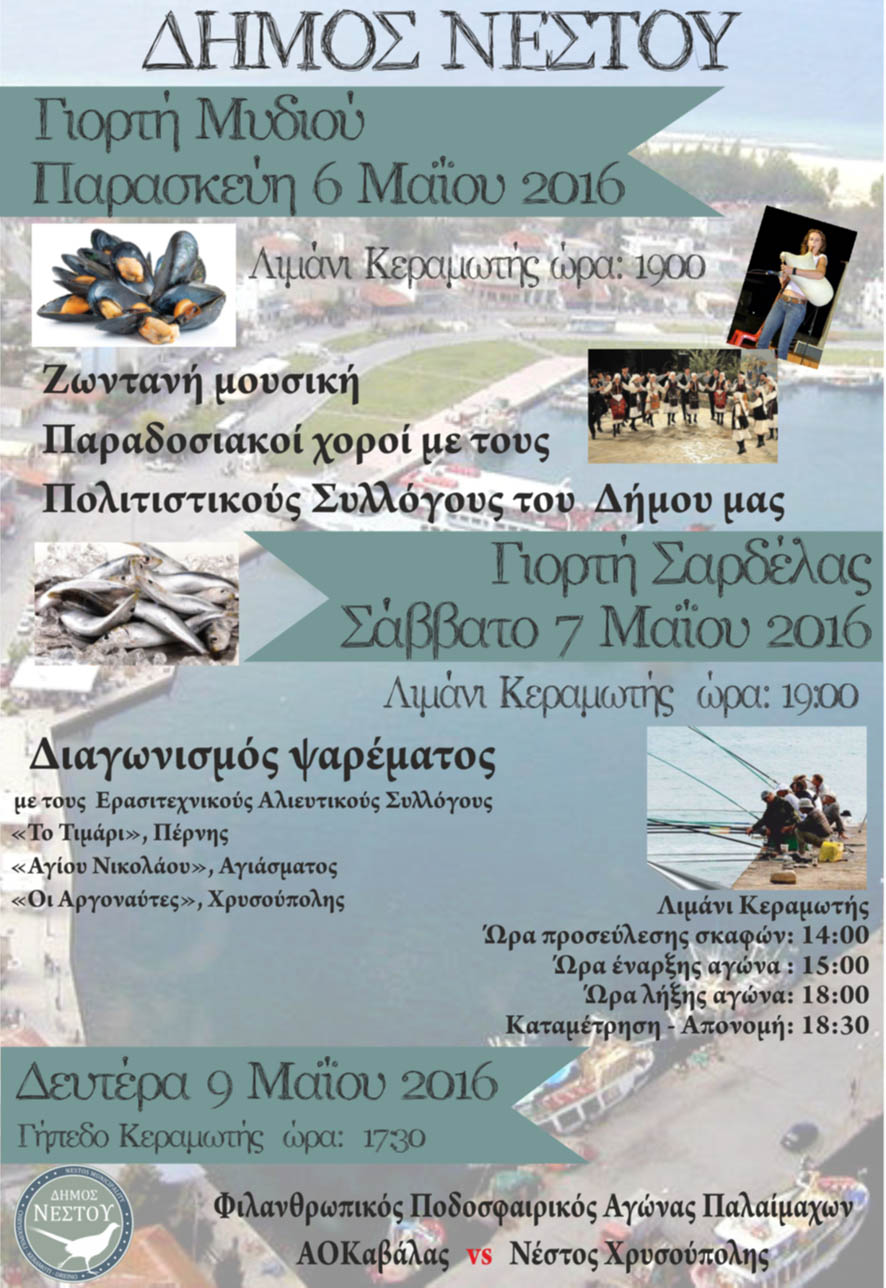 Όπως αναφέρει ο δήμαρχος Νέστου Βαγγέλης Τσομπανόπουλος, οι εκδηλώσεις ξεκινούν την Παρασκευή από τις 7 μ.μ. Θα προσφέρονται δωρεάν στο κοινό τα εξαιρετικής ποιότητας μύδια (γνωστά όχι μόνο εντός αλλά και εκτός Ελλάδας) και θα συνοδεύονται με ντόπιο ούζο εξαιρετικής ποιότητας. Την γιορτή θα πλαισιώσει η μελωδική φωνή της Μίνας Μαναβάκη, με την ορχήστρα της, καθώς και οι μικροί χορευτές των πολιτιστικών συλλόγων Νέας Καρυάς – Χρυσοχωρίου – Ερατεινού και Θρακιωτών Χρυσούπολης.