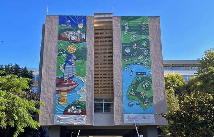 Στο πλαίσιο των δράσεων προώθησης της τουριστικής και πολιτιστικής κληρονομιάς της Π.Ε.Καβάλας, η Διεύθυνση Ανάπτυξης της Π.Ε.Καβάλας και ο Αντιπεριφερειάρχης Αλέξης Πολίτης, την Παρασκευή 4 Αυγούστου 2023, προχώρησαν στην τοποθέτηση δύο μεγάλου μεγέθους καμβάδων στη βόρεια πλευρά του Διοικητηρίου της πόλης, επί της οδού Ερυθρού Σταυρού.