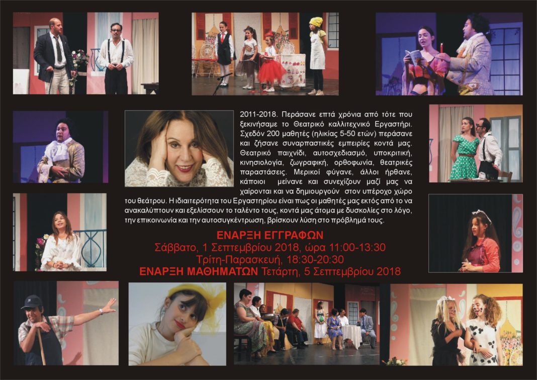 Επτά χρόνια περάσανε από τότε που ξεκινήσαμε το Θεατρικό καλλιτεχνικό Εργαστήρι. Σχεδόν 200 μαθητές(ηλικίας 5-50 ετών) περάσανε και ζήσανε συναρπαστικές εμπειρίες κοντά μας. Θεατρικό παιχνίδι, αυτοσχεδιασμό, υποκριτική, κινησιολογία, ζωγραφική,