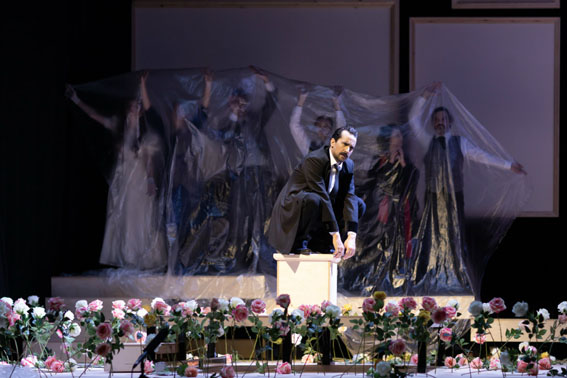 Ευρηματική και εικαστικά αναντιλέκτως ευφάνταστη η έναρξη. Ένας ολάνθιστος λειμώνας από ρόδα στο παλκοσένικο με υπερμεγέθεις αντανακλάσεις σε κάδρα τοίχου. Μια εικαστική εγκατάσταση, σημείο σύγκλισης γεγονότων και συνιστώσα δρώσα στο παρόν, συμπληρωματικά μεν, καίρια δε στην εξιστόρηση του μύθου. Που δεν είναι μύθος. Είναι αληθινή ιστορία ανεκπλήρωτου έρωτα, στεφανωμένη από ιστορικές αλήθειες.