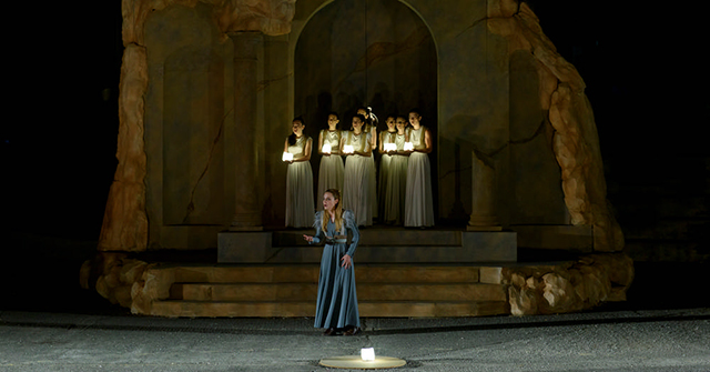 Η Χάρις Αλεξίου ως θεά Αθηνά, αγαλματώδης, έκλεισε ήρεμα την παράσταση. Η στεντόρεια φωνή και το κατηγορηματικό ύφος της, δωρίζουν στο συνολικό σκηνικό πόνημα μια επιτυχή έκβαση. Ευτυχής η ιδέα από την παραγωγή, άλλωστε, να συμπεριλάβει στον θίασο την αγαπημένη τραγουδίστρια. Αποδείχθηκε ισχυρότατος πόλος έλξης θεατών.