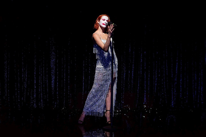 «Εν τω μεταξύ, πρέπει να γελάτε μέχρι να κλάψετε», μας διαβεβαιώνει ο οικοδεσπότης μπροστά στο βαθυκόκκινο φόντο. Μια ατμόσφαιρα καμπαρέ, στρας και γκλίτερ ενισχύουν τη θεατρική ψευδαίσθηση και συγκεντρώνουν την προσοχή μας στο θέαμα της βαρύτητας, δανεισμένο από την πραγματικότητα, μέσα από τα σκηνικά των Σάκη Μπιρμπίλη- Άρη Κακλέα ( ένα γυάλινο δάπεδο – καθρέπτης, μια κουρτίνα στραφταλιζέ – αυλαία κι ένα κανονικό φέρετρο) και τα φαντεζί κοστούμια της Θωμαΐδος Παπαδημητρίου.