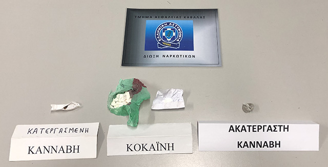 Κατασχέθηκαν συνολικά 66,7 γραμμάρια ακατέργαστης κάνναβης, 26,7 γραμμάρια κοκαΐνης και μικροποσότητα κατεργασμένης κάνναβης..